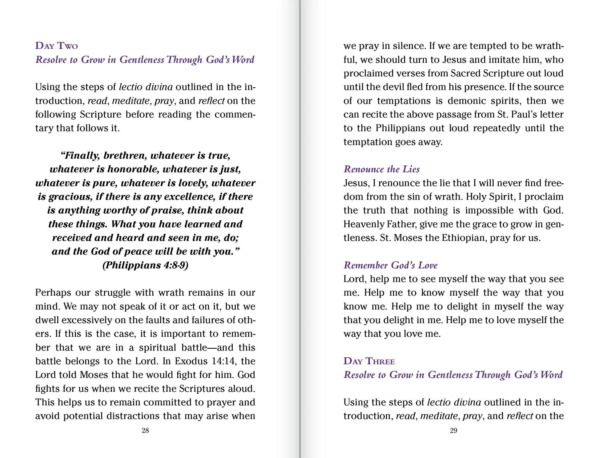 - A daily examination of conscience to help readers evaluate wins and growth areas.