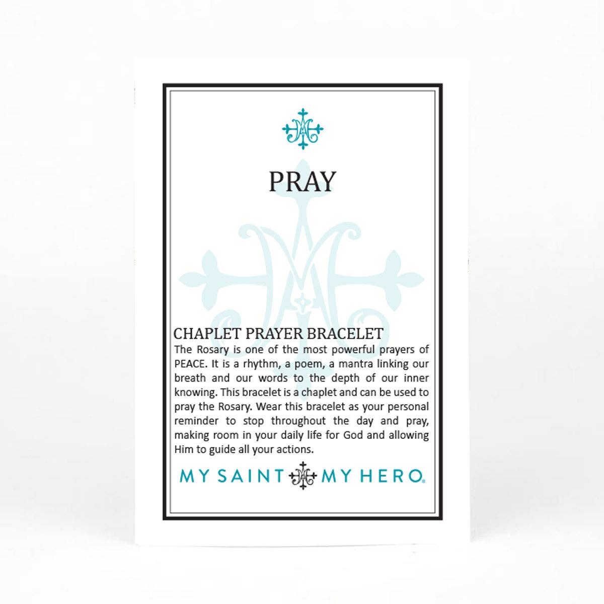 The Rosary is one of the most powerful prayers of PEACE. It is a rhythm, a poem, a mantra linking our breath and our words to the depth of our inner knowing. This bracelet is a chaplet and can be used to pray the Rosary. Wear this bracelet as your personal reminder to stop throughout the day and pray, making room in your daily life for God and allowing Him to guide all your actions.