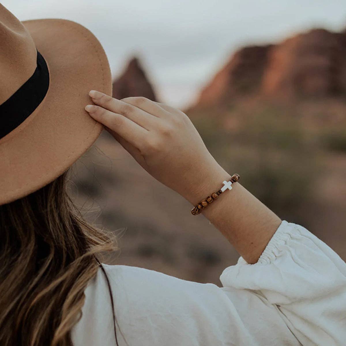 * Howlite cross and olive wood beads are woven in a rosary bracelet style
